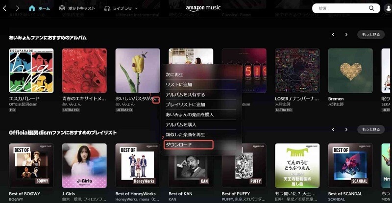 ステップ1、Amazon Music Web版やアプリで購入した楽曲やアルバムは自動的にライブラリへ追加されます。